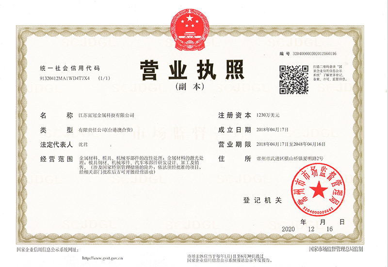 江蘇富冠金屬科技有限公司(以下簡稱:“公司”)成立于2018年4月,隸屬于鑫昌泰集團,是常州市經開區招商引資的重點外資企業,注冊資本1230萬美元,座落于常州市經開區橫山橋智能裝備產業園,占地面積22762.8平方米,員工總數100人。公司主要經營:金屬材料、模具、機械零部件的改性處理;金屬材料的激光處理;模具鋼材、機械零件、汽車零部件研發(fā)設計、加工及銷售。并具有真空淬火、普通淬火、調質、去應力回......